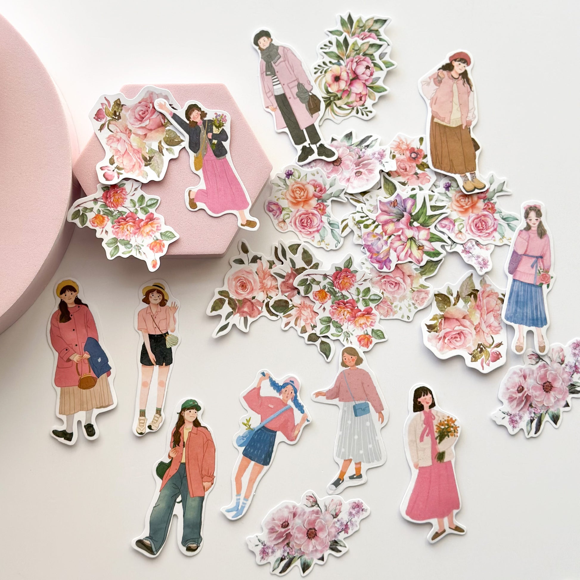 Flower picking girls sticker pack - Pink - washi stickers