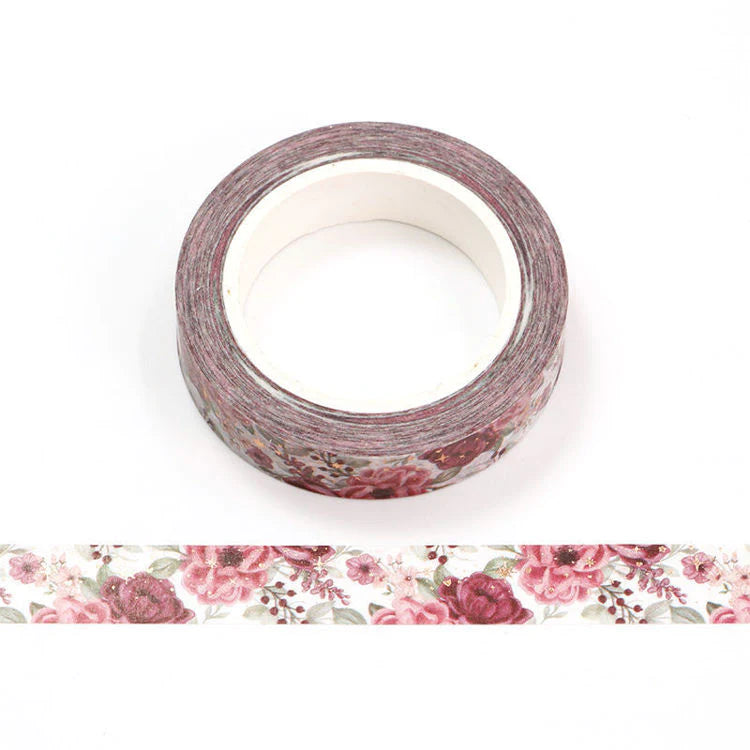 Pink flowers & gold stars washi tape - 10m